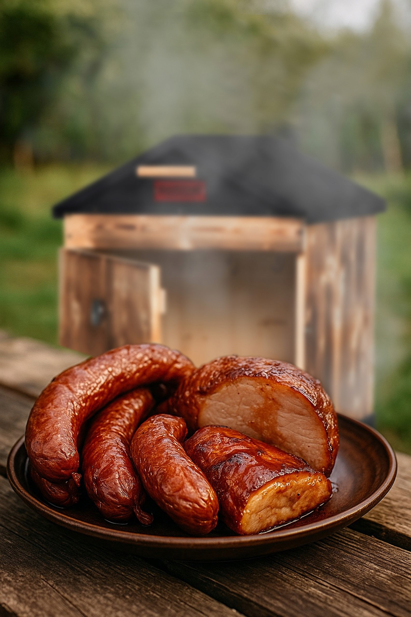 Dřevěná zahradní udírna s kovovou střechou – stabilní, odolná, připravená na poctivé uzení