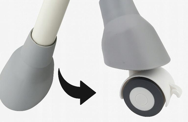 Velikost nožiček zajišťuje stabilitu židličky. Rozestup nohou ji dodatečně stabilizuje. Kovové nohy a montáž pomocí „klik“ zámků posilují konstrukci. Volitelné kolečka usnadňují přesouvání a mají také brzdu.