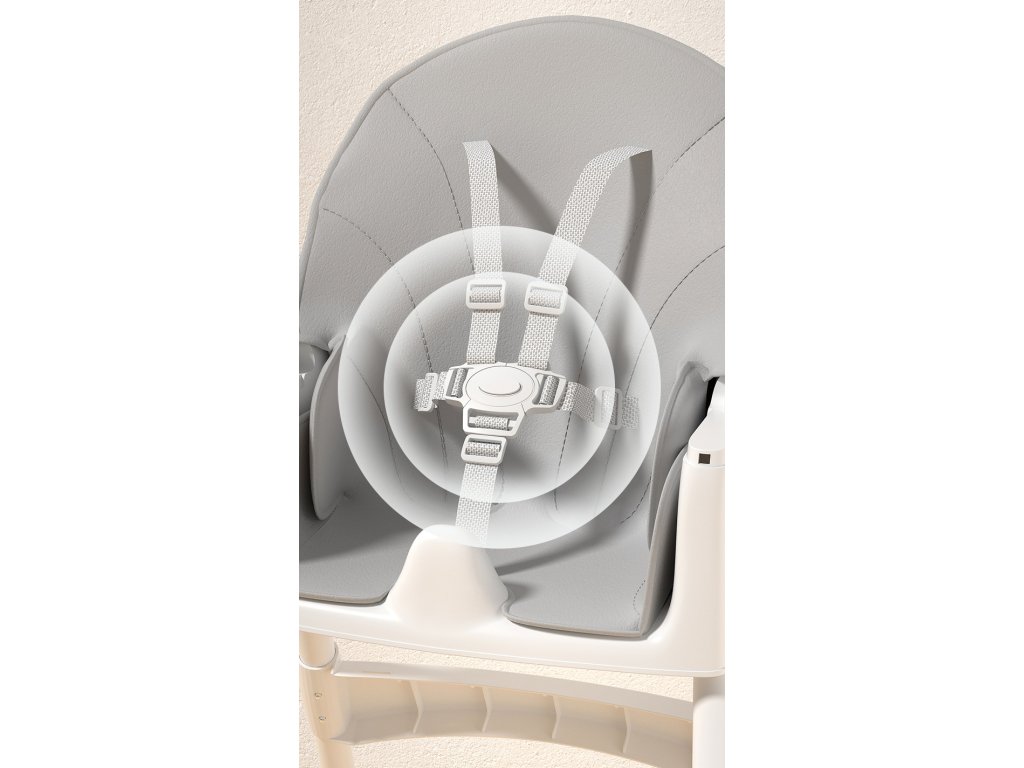 Možnost nastavení opěradla umožňuje používání židličky již od 6 měsíců, i když dítě ještě nesedí samostatně. Měkká vložka zvyšuje pohodlí a pětibodové pásy zajišťují bezpečnost pro rodiče i dítě.